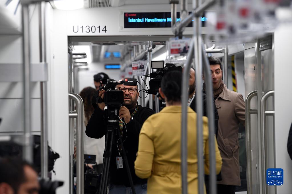 1月22日,在土耳其伊斯坦布尔,媒体记者在伊斯坦布尔新机场线地铁列车内采访。
