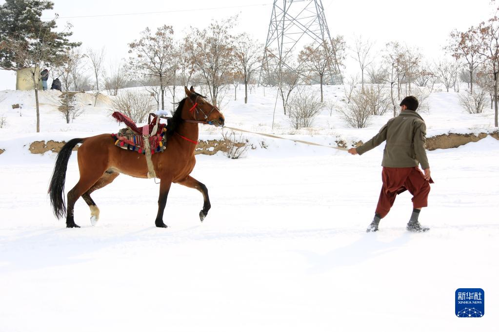 1月23日,在阿富汗首都喀布尔,一名男子牵马从雪地上走过。