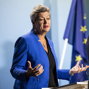 1月26日,在瑞典首都斯德哥尔摩,欧盟委员会负责内部事务的委员于尔娃·约翰松(左)在新闻发布会上发言。新华社发(瑞典政府供图/约翰内斯·弗兰德森摄)