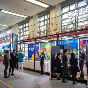 2021年11月16日,第十四届中国—拉美企业家高峰会在重庆以线上线下相结合方式举办。参会嘉宾在高峰会合作展上交谈、参观。新华社记者唐奕摄