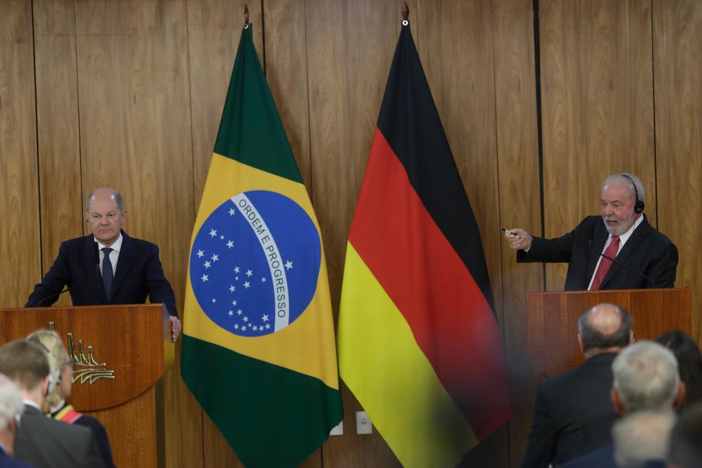 1月30日,巴西总统卢拉(右)和德国总理朔尔茨在巴西利亚共同出席新闻发布会。新华社发(卢西奥·塔沃拉摄)