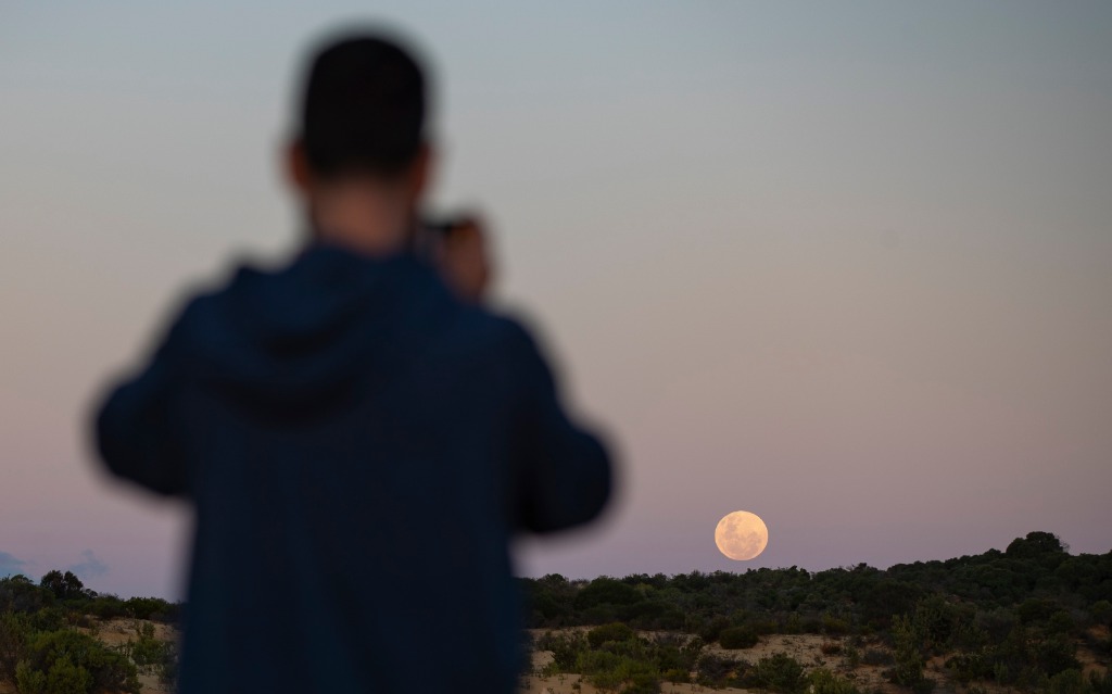 2022年6月14日,一名男子在位于澳大利亚西澳大利亚州的尖峰石阵拍摄“超级月亮”。(新华社记者白雪飞摄)