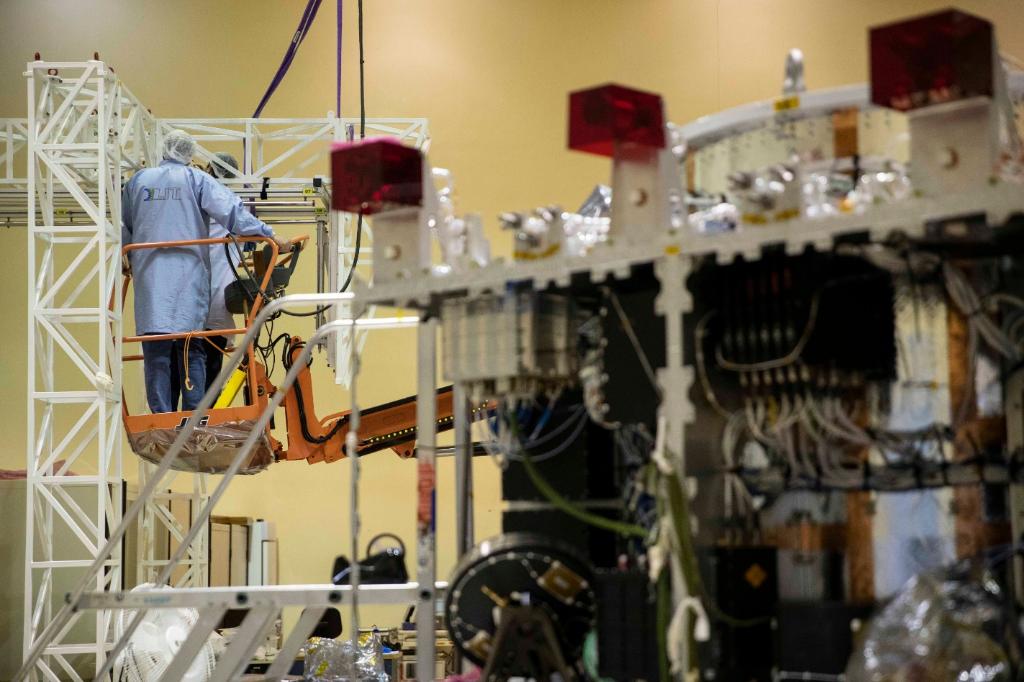 2018年8月31日,在位于巴西圣保罗州圣若泽杜斯坎普斯市的巴西国家空间研究所,工作人员在中巴04A卫星旁工作。(新华社记者李明摄)