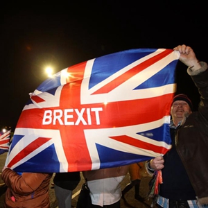 2020年1月31日晚,在英国北爱尔兰贝尔法斯特,支持“脱欧”的人们参加庆祝集会。伦敦时间1月31日晚11时,英国正式“脱欧”,结束其47年的欧盟成员国身份。新华社发(保罗·麦克兰摄)