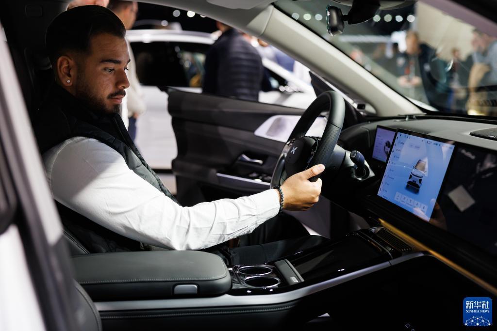 2月3日,一名男子在瑞典斯德哥尔摩举办的电动车展上试驾小鹏电动车。