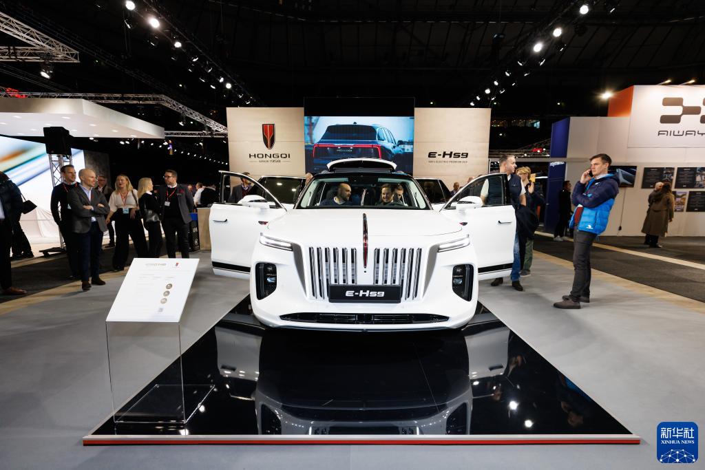 2月3日,人们在瑞典斯德哥尔摩举办的电动车展上参观红旗电动车。