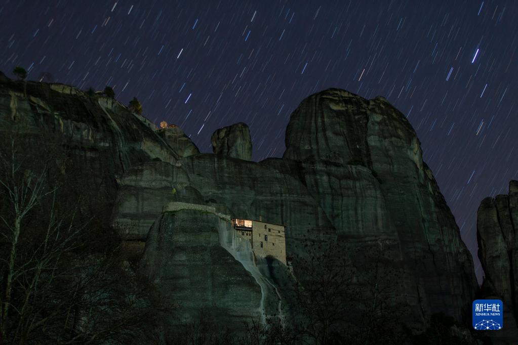这是2月1日拍摄的星空下的希腊迈泰奥拉修道院和砂岩峰。