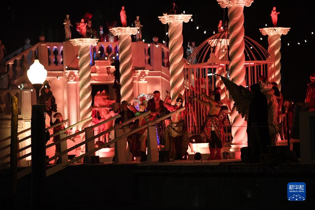 2月4日,在意大利威尼斯,演员参加水上巡游表演。