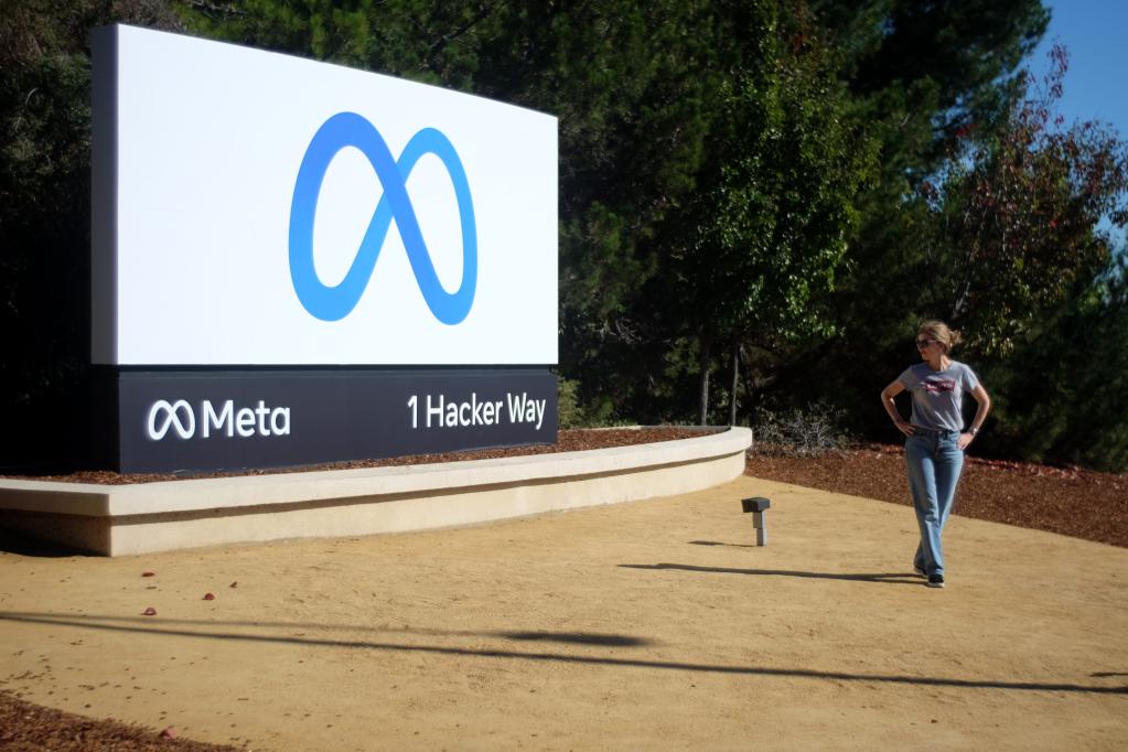 2021年10月,在美国旧金山湾区,一名女子站在“元”标志牌前。新华社记者 吴晓凌摄