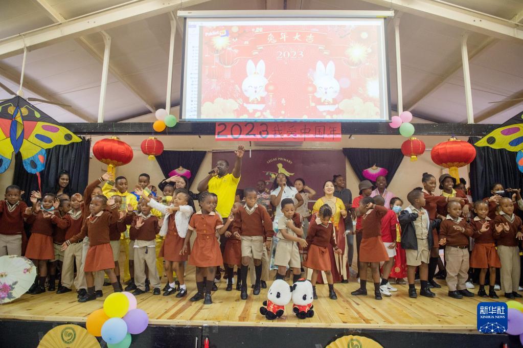 2月3日,在博茨瓦纳首都哈博罗内,博茨瓦纳大学孔子学院在教学点丽海国际小学举办“我爱中国年”迎新春活动。这是老师和学生一起表演节目。