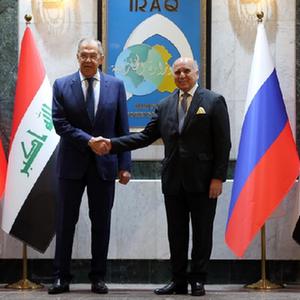 2月6日,在伊拉克首都巴格达,伊拉克外长侯赛因(右)与到访的俄罗斯外长拉夫罗夫握手致意。新华社发(哈利勒·达伍德摄)