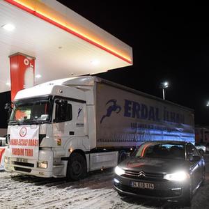 这是2月6日晚在土耳其伊斯坦布尔至安卡拉公路上拍摄的运往灾区的大型机械。