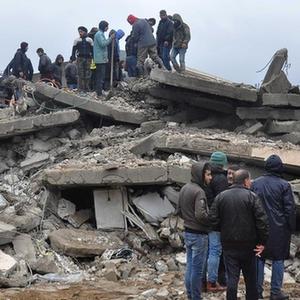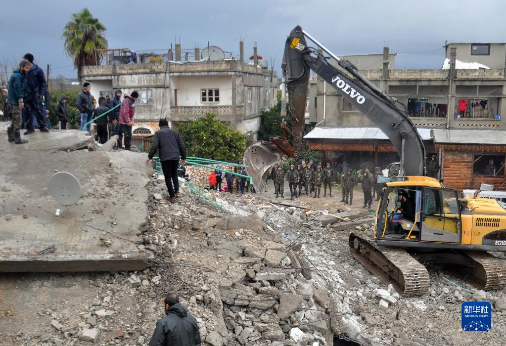 2月6日,在叙利亚拉塔基亚省杰卜莱,人们在一处倒塌的建筑现场进行救援。新华社发
