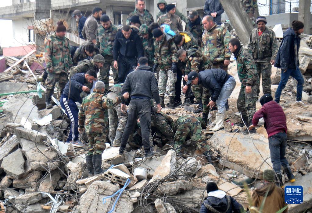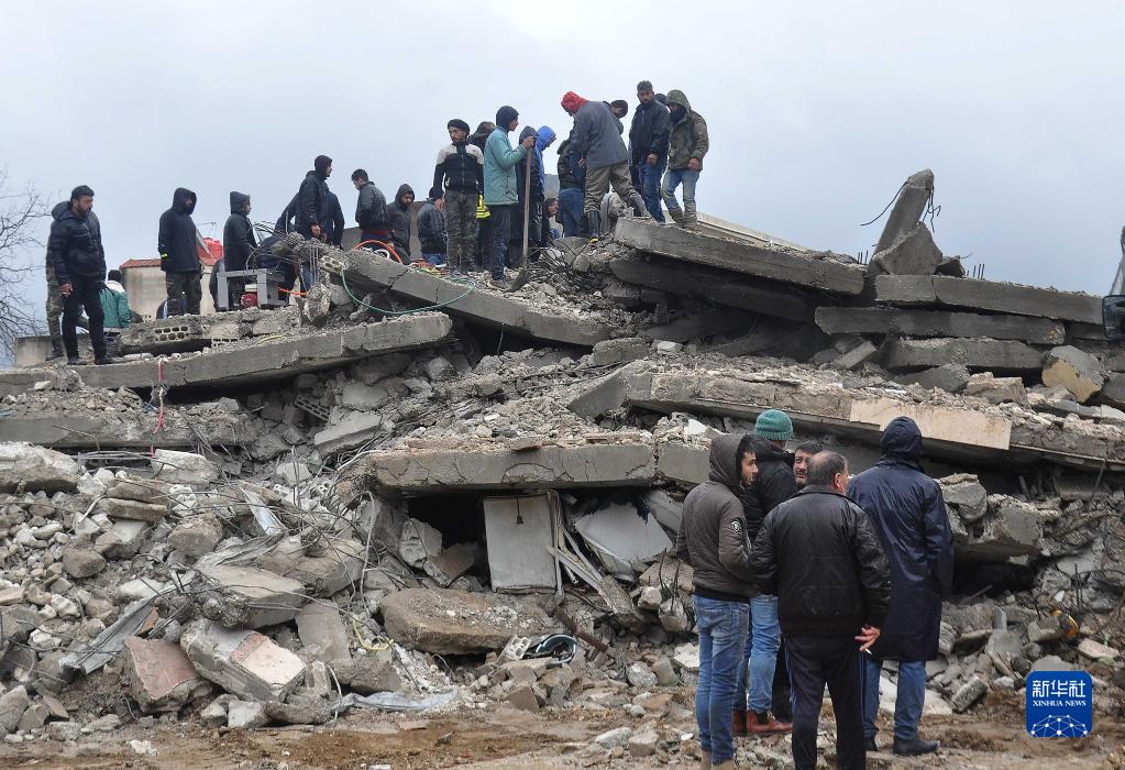 2月6日,人们在叙利亚拉塔基亚省杰卜莱一处倒塌的建筑现场进行救援。新华社发