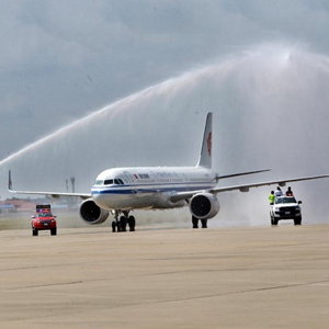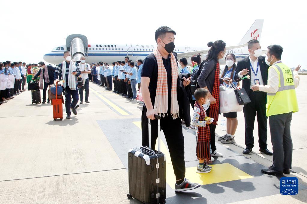 2月7日,一架载有中国乘客的国航航班从北京出发抵达柬埔寨首都金边国际机场,受到柬埔寨热烈欢迎。新华社发(批隆摄)