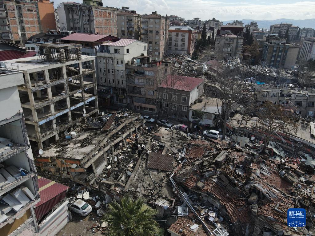这是2月7日在土耳其南部卡赫拉曼马拉什市市中心拍摄的震后景象(无人机照片)。卡赫拉曼马拉什市是本次地震重灾区卡赫拉曼马拉什省省会,是遭受地震破坏最为严重的城市之一。