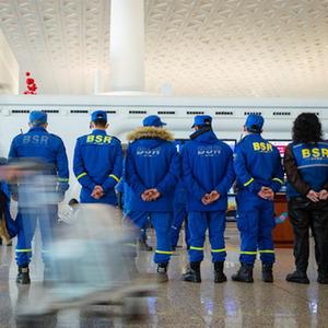 2月8日,蓝天救援队队员在机场大厅内搬运行李物资。