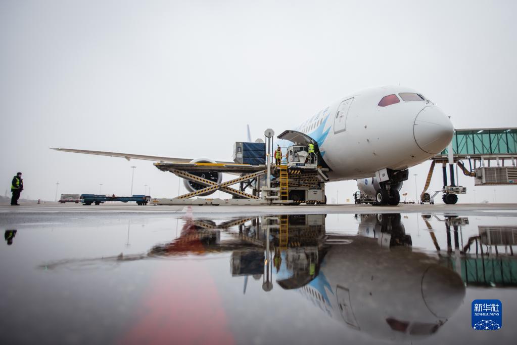 2月8日,机场工作人员将救援物资运入飞机货仓。
