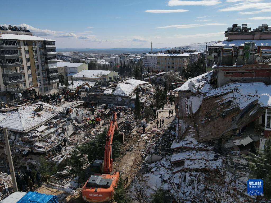 2月8日,在土耳其阿德亚曼省贝斯尼,救援人员在地震废墟搜救(无人机照片)。