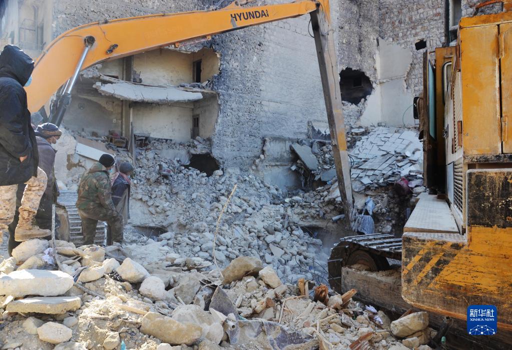 2月8日,救援人员在叙利亚阿勒颇的一处地震废墟搜救。