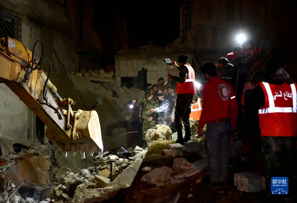 2月8日,救援人员在叙利亚大马士革的一处地震废墟搜救。