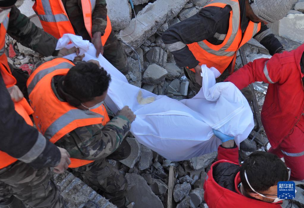 2月8日,救援人员在叙利亚拉塔基亚省的一处地震废墟转移遇难者遗体。