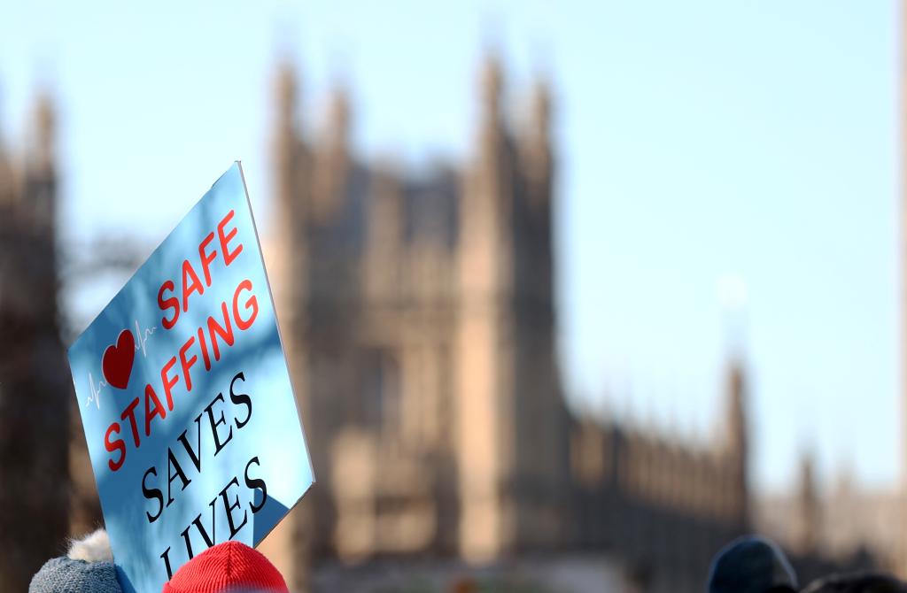 2月6日,在英国伦敦,医疗系统工作人员参加罢工游行。新华社记者李颖摄