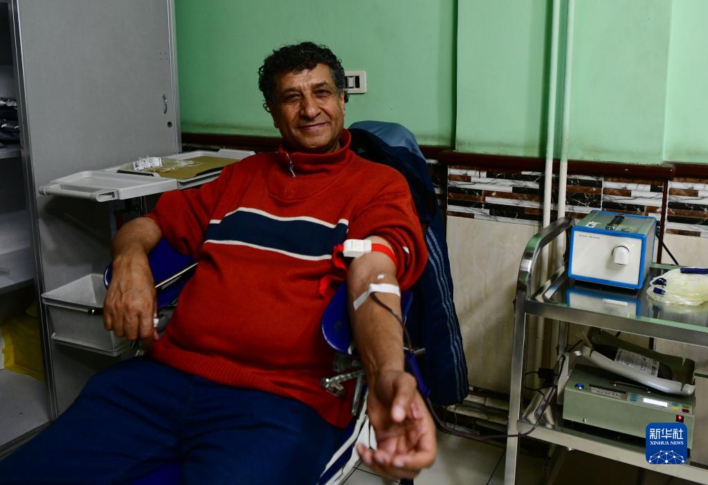2月8日,一名男子在叙利亚首都大马士革一处献血中心献血。