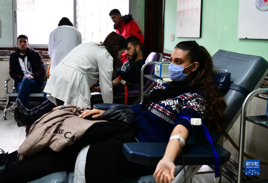 2月8日,民众在叙利亚首都大马士革一处献血中心献血。