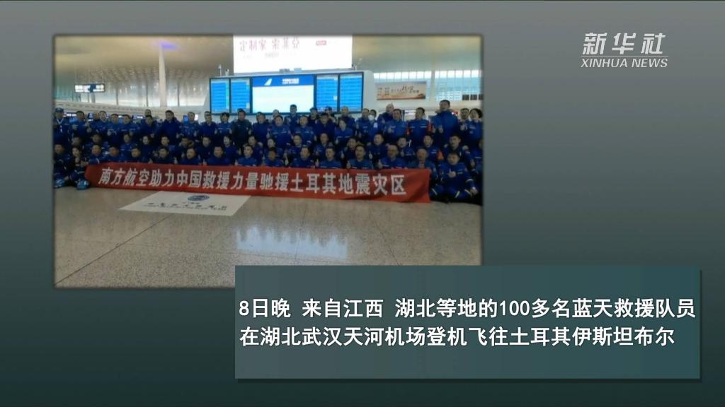 8日晚,来自江西、湖北等地的100多名蓝天救援队员在湖北武汉天河机场登机,飞往土耳其伊斯坦布尔,参与救援工作。