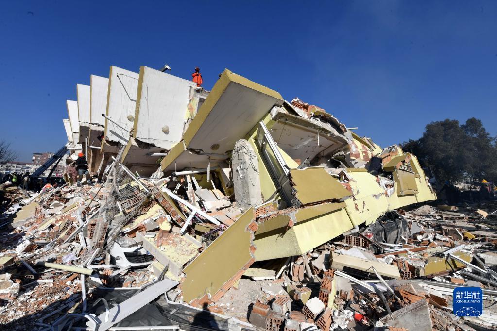 2月9日,中国救援队队员在土耳其哈塔伊省安塔基亚市的受损建筑上开展救援工作。