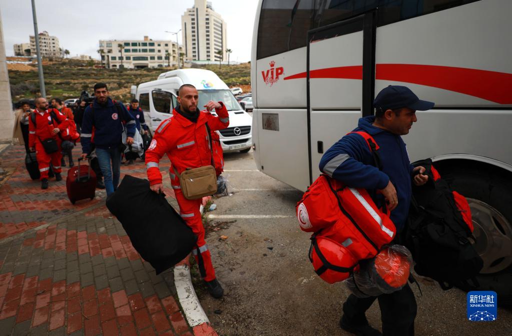 2月9日,在约旦河西岸城市拉姆安拉,巴勒斯坦救援队队员准备启程奔赴震区。