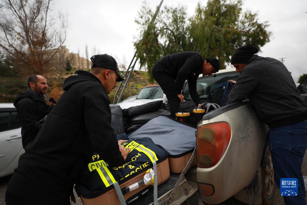 2月9日,在约旦河西岸城市拉姆安拉,巴勒斯坦救援队队员将救援物资装车。