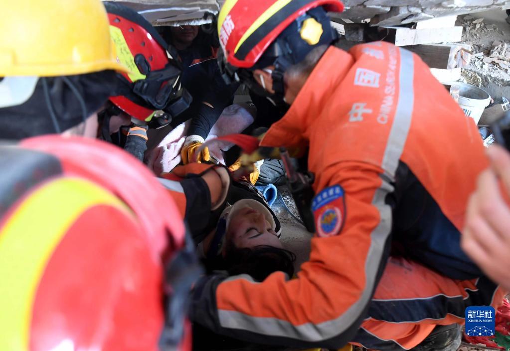 在土耳其南部地震重灾区哈塔伊省安塔基亚市,中国救援队同土耳其救援队合作,于当地时间9日下午救出一名被埋在楼房废墟下的女性幸存者。新华社记者 沙达提 摄