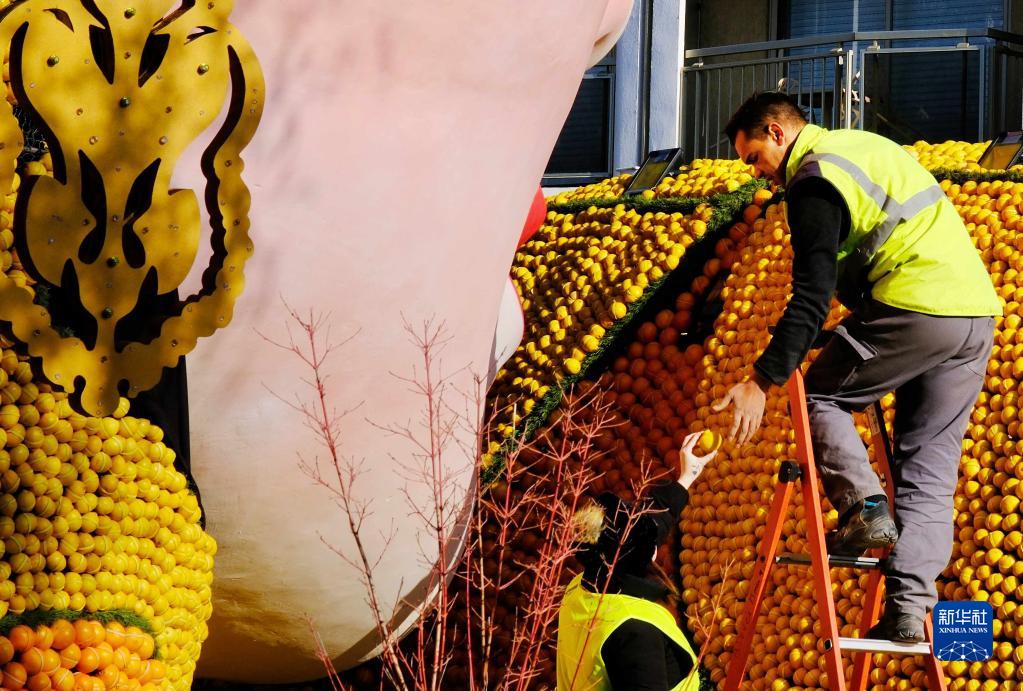 2月9日,在法国南部小城芒通,工作人员为柠檬节做最后准备。
