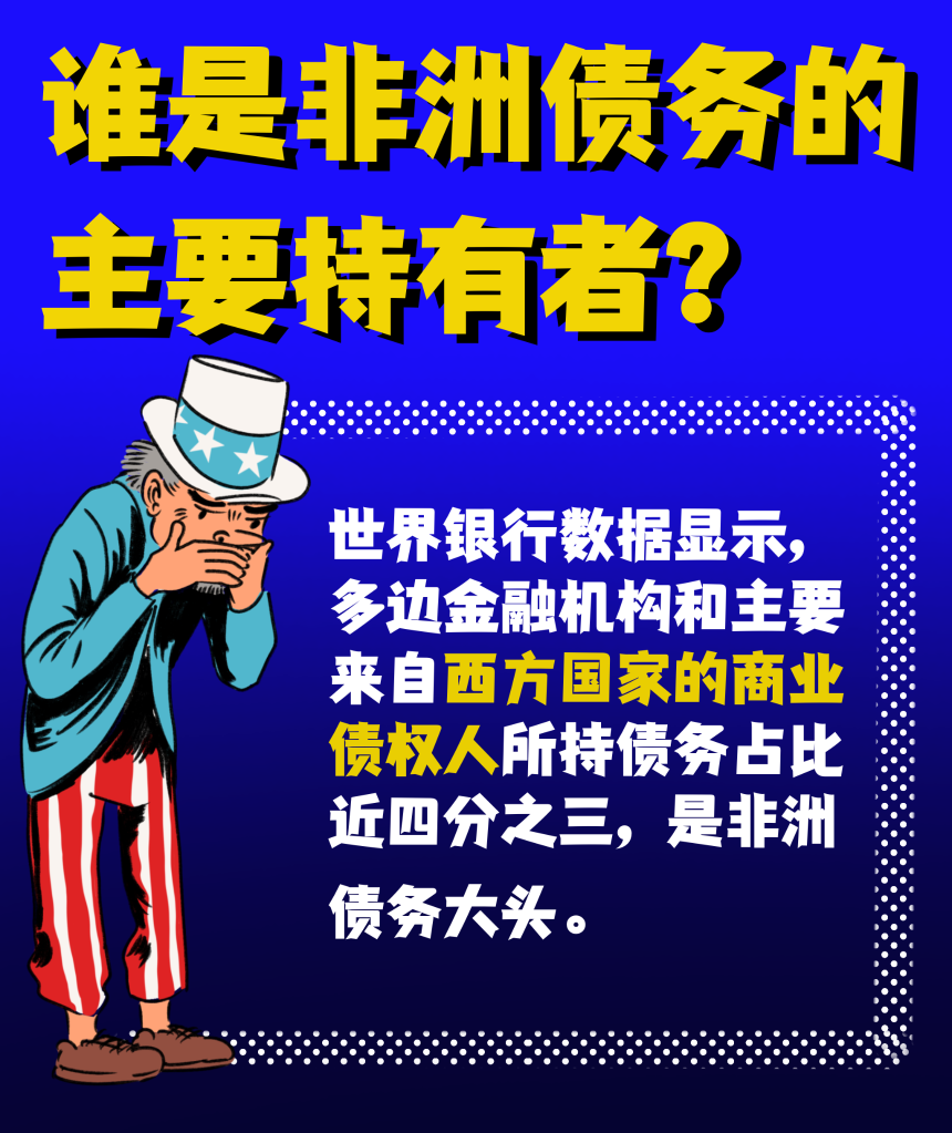 世界银行去年数据显示,在49个有数据可查的非洲国家共计6960亿美元外债中,多边金融机构和商业债权人所持债务占比近四分之三,是非洲债务大头。