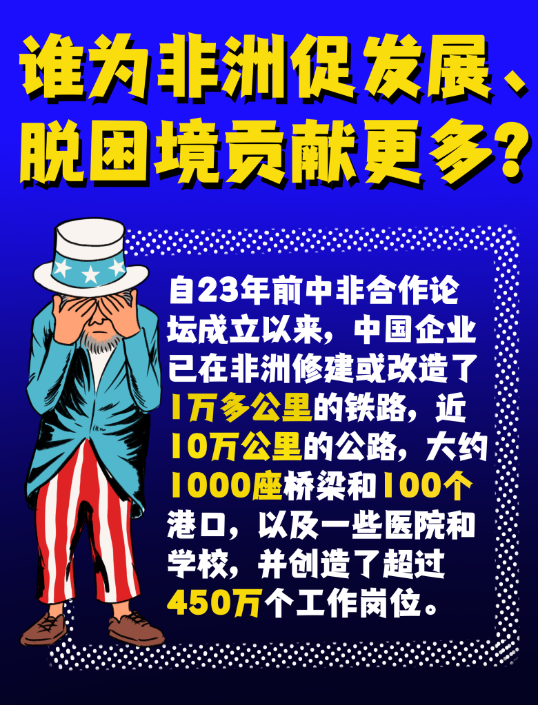 统计数据显示,自中非合作论坛成立以来,中国企业为非洲新建和升级铁路超过1万公里、公路近10万公里、桥梁近千座、港口近百个,还有大量医院和学校,累计创造超过450万个就业岗位。
