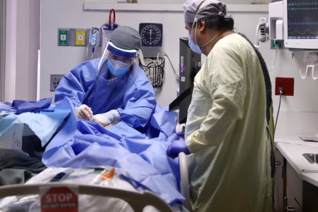 这是2021年1月22日,在美国加利福尼亚州蒙特贝洛市贝弗利医院,医护人员在“新冠病区”治疗病人。新华社发