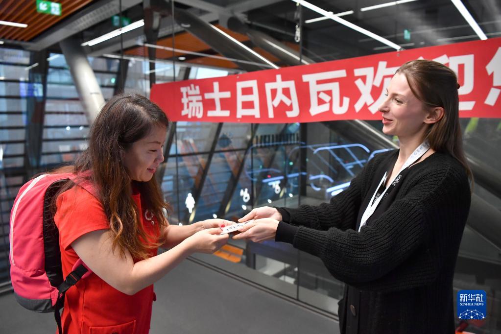 2月9日,在瑞士日内瓦国际机场,中国旅客接受日内瓦旅游局工作人员递上的瑞士特色纪念品。