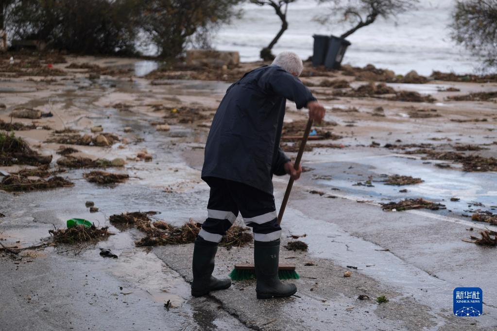 2月10日,在马耳他纳沙尔,一名男子在街头清理风暴过后的垃圾。