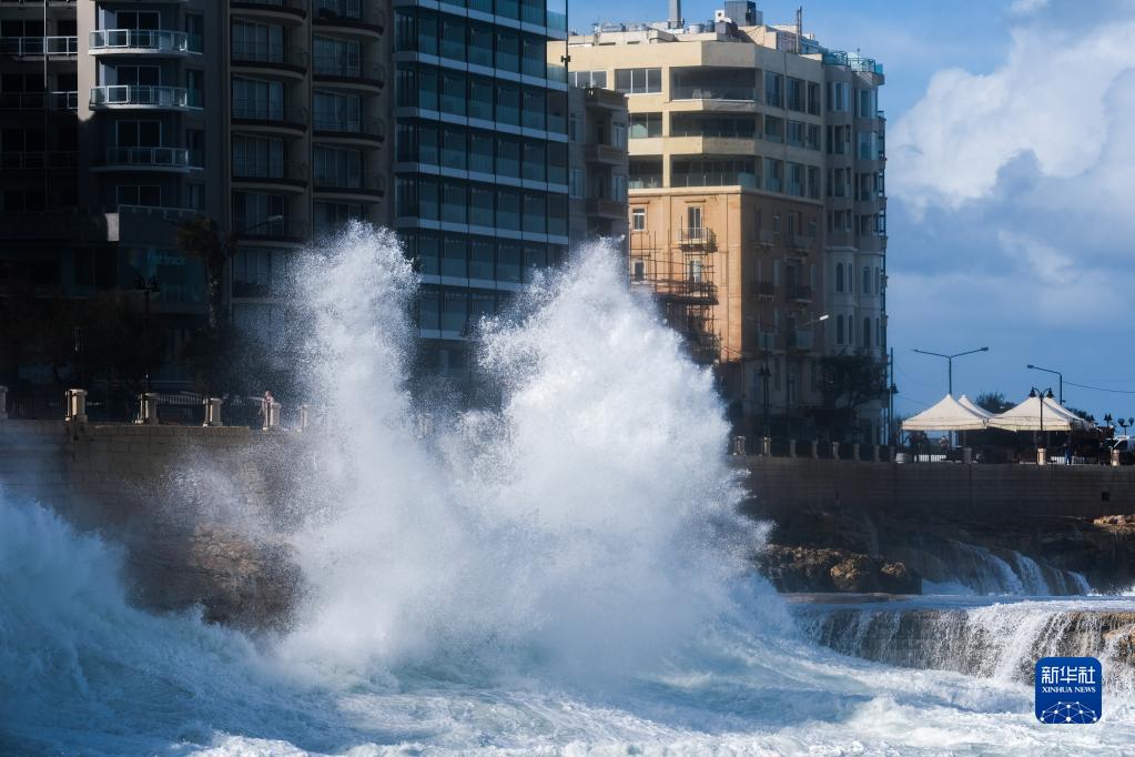 2月10日,在马耳他斯利马,大浪拍打海岸。