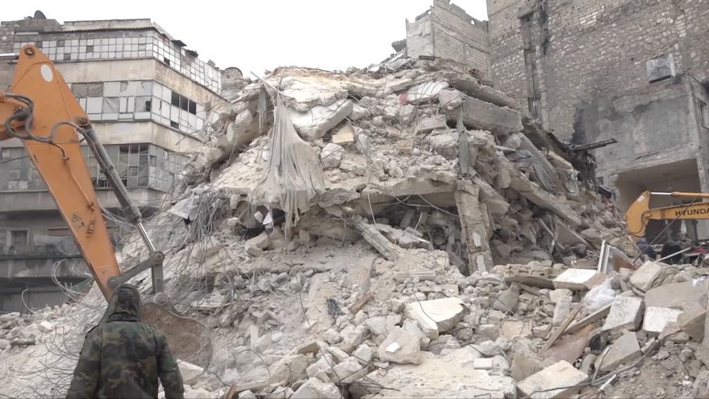 叙利亚北部阿勒颇省是受灾最严重的省份之一。首府阿勒颇市建筑密集、人口集中,大量建筑物年代久远,加上在内战中受损,地震中房屋垮塌尤为严重。垮塌建筑旁,雨后的道路泥泞难行。挖掘机在废墟上“轰轰”作业,建筑废墟庞大、细碎又层层交叠,钢筋铁丝穿插其中,搜救难度很大。
