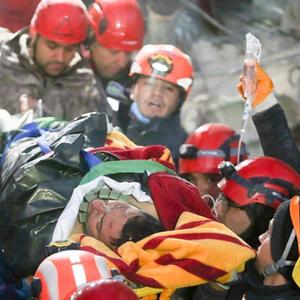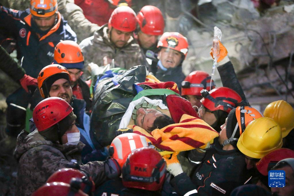 2月10日晚,在土耳其加济安泰普省,救援人员转移获救的幸存者。