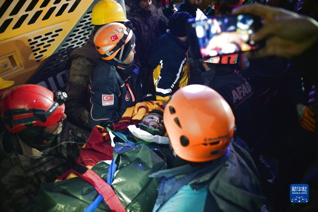 2月10日晚,在土耳其加济安泰普省,救援人员转移获救的幸存者。