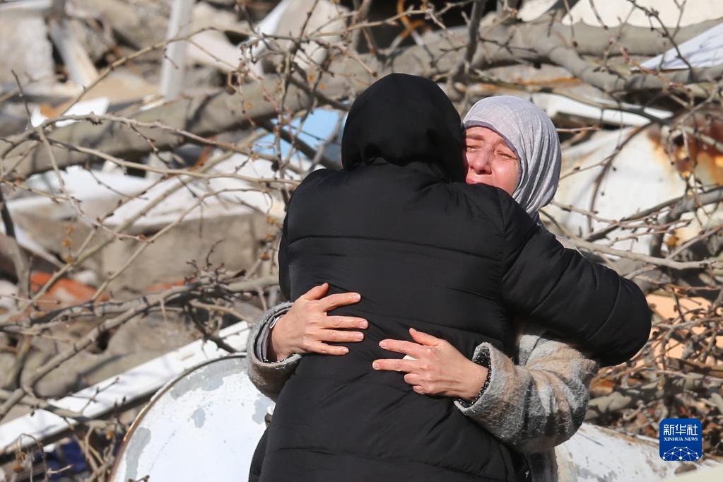 2月7日,灾民在土耳其南部卡赫拉曼马拉什市一处地震废墟前相互安慰。
