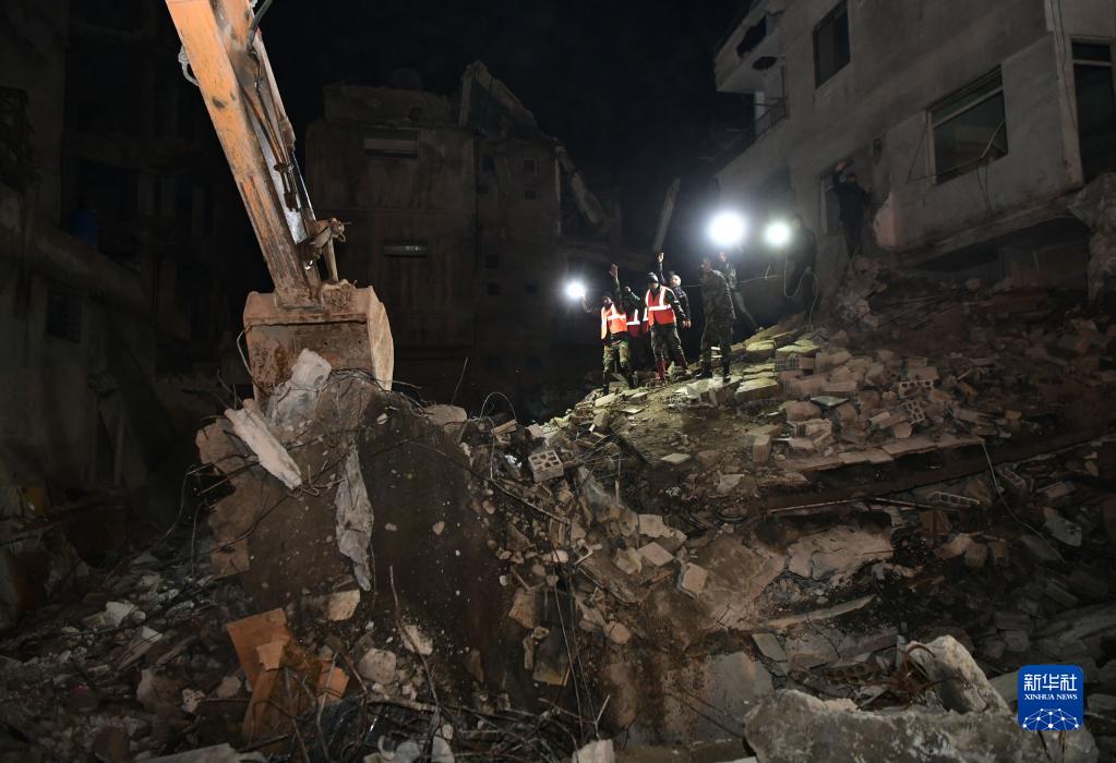 2月8日,救援人员在叙利亚大马士革的一处地震废墟搜救。