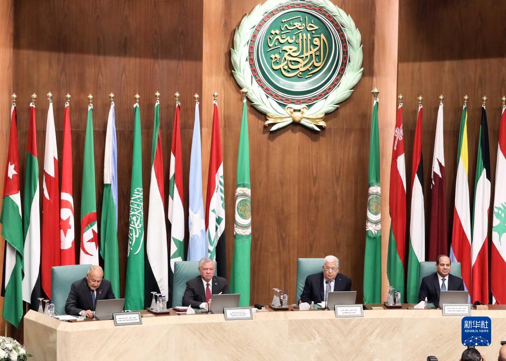2月12日,在位于埃及首都开罗的阿拉伯联盟总部,埃及总统塞西、巴勒斯坦总统阿巴斯、约旦国王阿卜杜拉二世、阿盟秘书长盖特(从右至左)出席会议。
