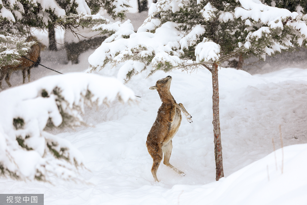 当地时间2月12日,伊朗德黑兰,大雪后,野生动物来到城市周围,在雪中玩耍。德黑兰的大雪和寒冷天气直接影响了靠近城区寻找食物的野生动物。(图片来源:视觉中国