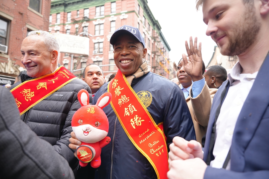 美国参议院民主党领袖舒默(左)、纽约市长亚当斯(中)手持沧州新年吉祥兔玩偶参加游行活动。赵晓乐摄