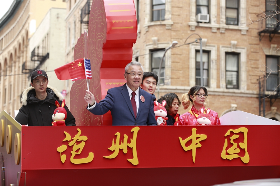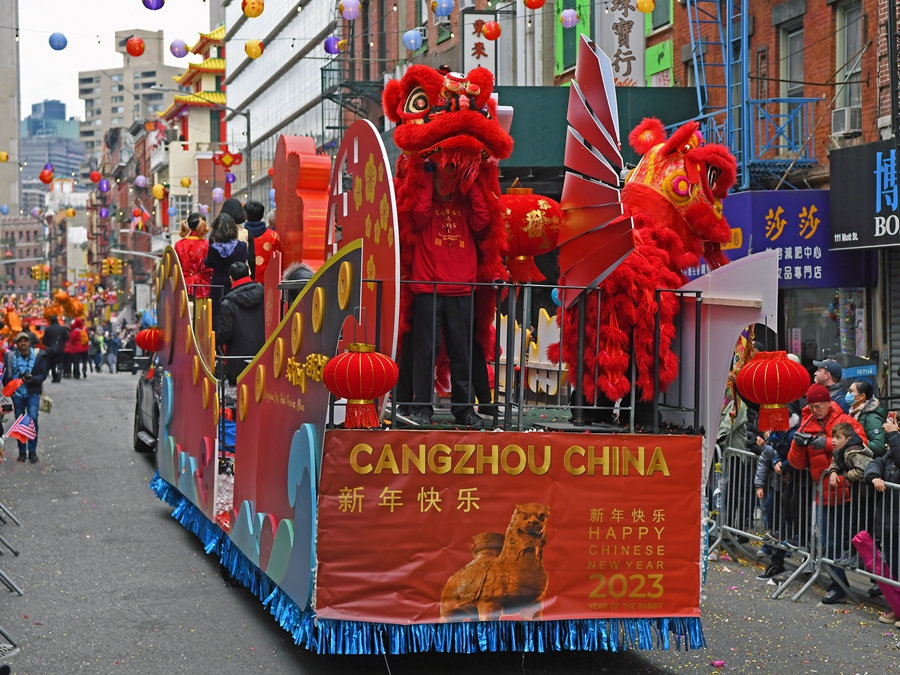 纽约是哈德逊河的出海口,也是美国的商业金融中心,当千年古运河“遇见”哈德逊河,东西方文化在花车游行中演奏出动人音符。通过“文武沧州,运河古城”主题花车,观众们近距离感受了古运河文化,共赴一场不分信仰和肤色的文化中国年。(施蓉)